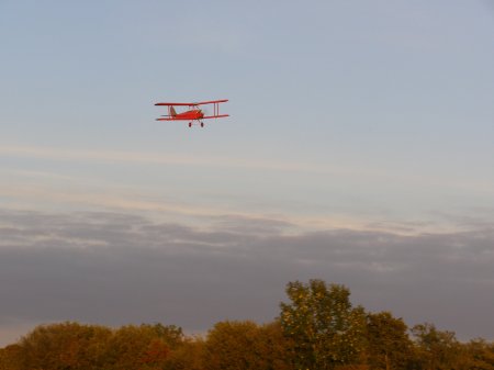 The Big Stearman Climbing out on it's first flight of many on Sunday. Nigel has the strip in great shape. |