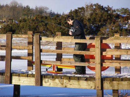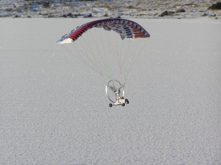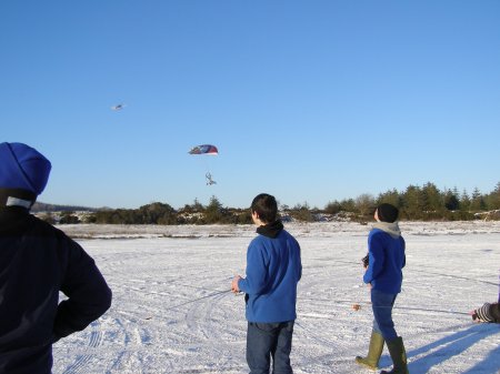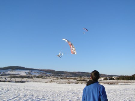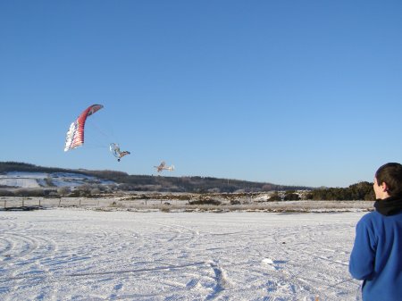 Shane and Chris have two new parakites (30euro jobbies on ebay!) and looked great flying over the snow covered lake in the blue sky. |