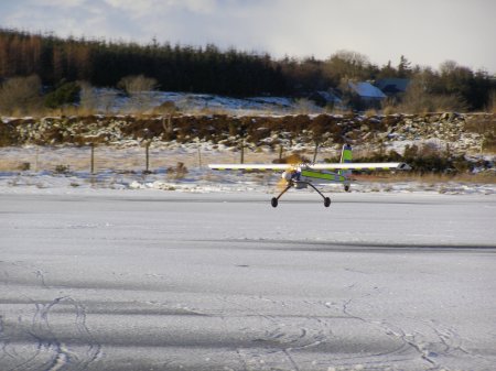 With an opertunity like this the cars were loaded for Saturday, and after sitting in the car for a snow shower to pass through, we made what I would think was the first Turbine Jet flight off a frozen lake in Ireland with the Boomerang !