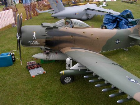 The Big Syraider below is 180" wing span (30%) weighs 190lbs (86kg) and is powered by a Moki 400cc 5 cylinder radial.