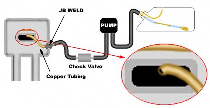 Above is a diagram of the system I use which consists of a switch-activated electric pump, Restrictor, and check valve. This should give you a good idea of the setup - The rest is up to how much you feel like tinkering!