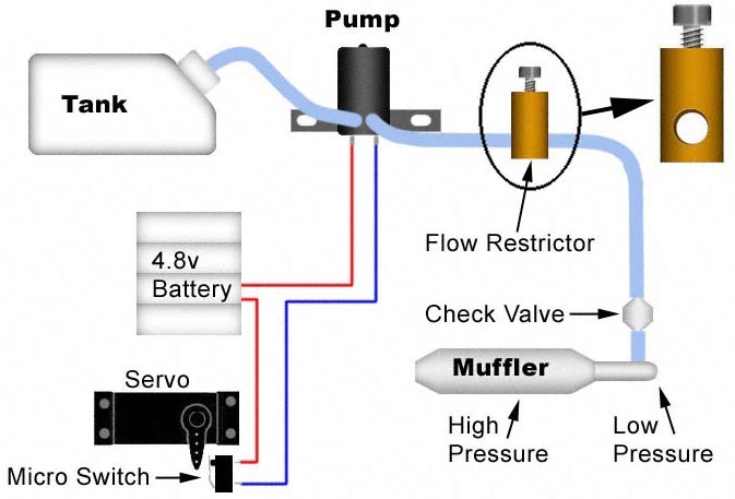 The Electric Pump is by far the easiest setup. It simply plugs into an auxiliary channel on your receiver, and into a separate (usually 4.8v) power supply. There are many commercially available pumps on the market, but I use a windshield washer replacement pump from the J.C Whitney website and turn it on and off with a servo-activated microswitch.